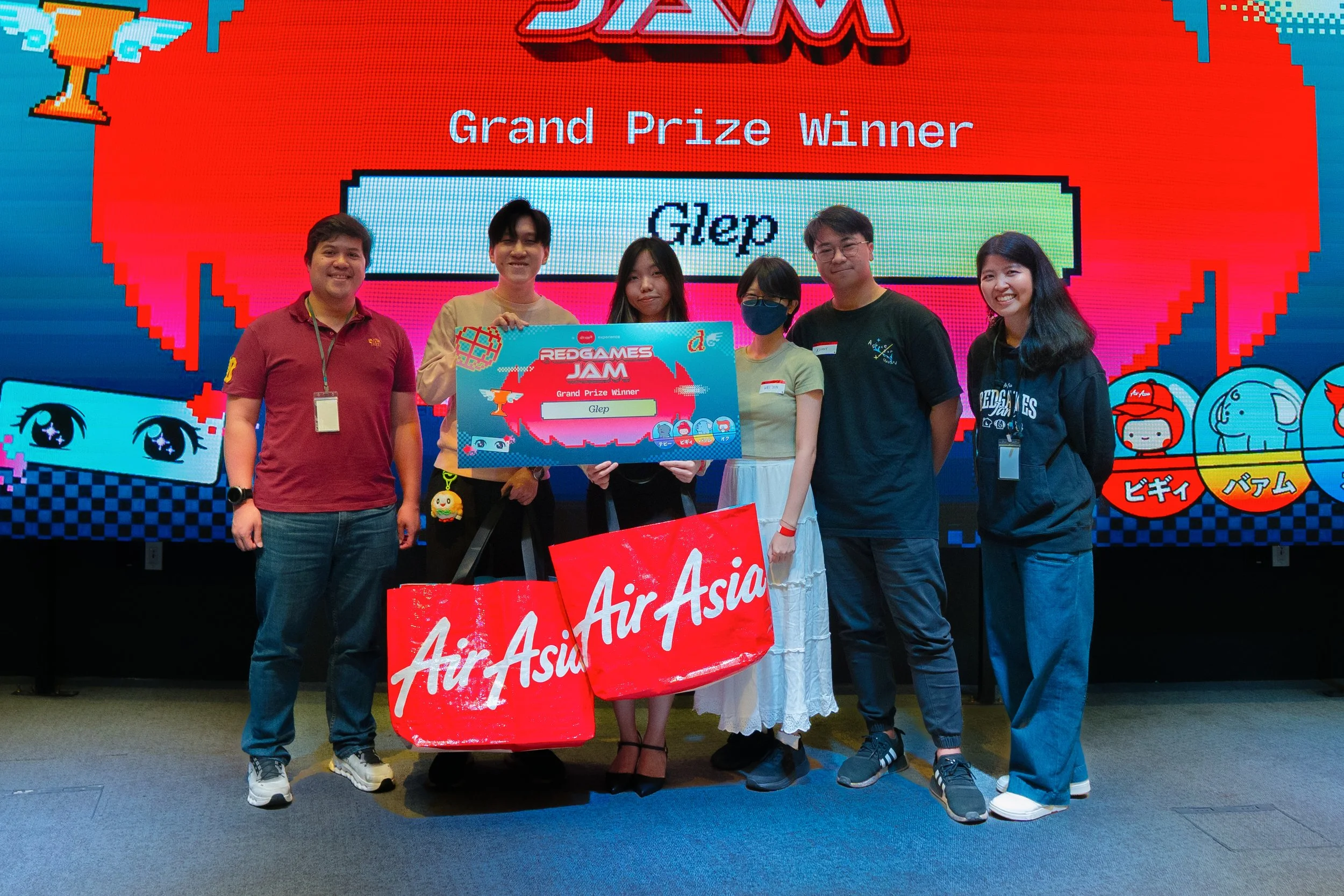 Photo caption: The top 3 winners from RedGames Jam 2025 pose for a group photo with the AirAsia brand co. team.
