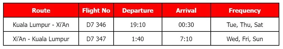 This resumption of three weekly flights aligns with AAX's commitment to strengthen its presence in China with five destinations while complementing the AirAsia Group's 12th destination in Mainland China. In addition, the resumed service marks AAX as the sole airline offering direct flights between Kuala Lumpur and Xi'An.